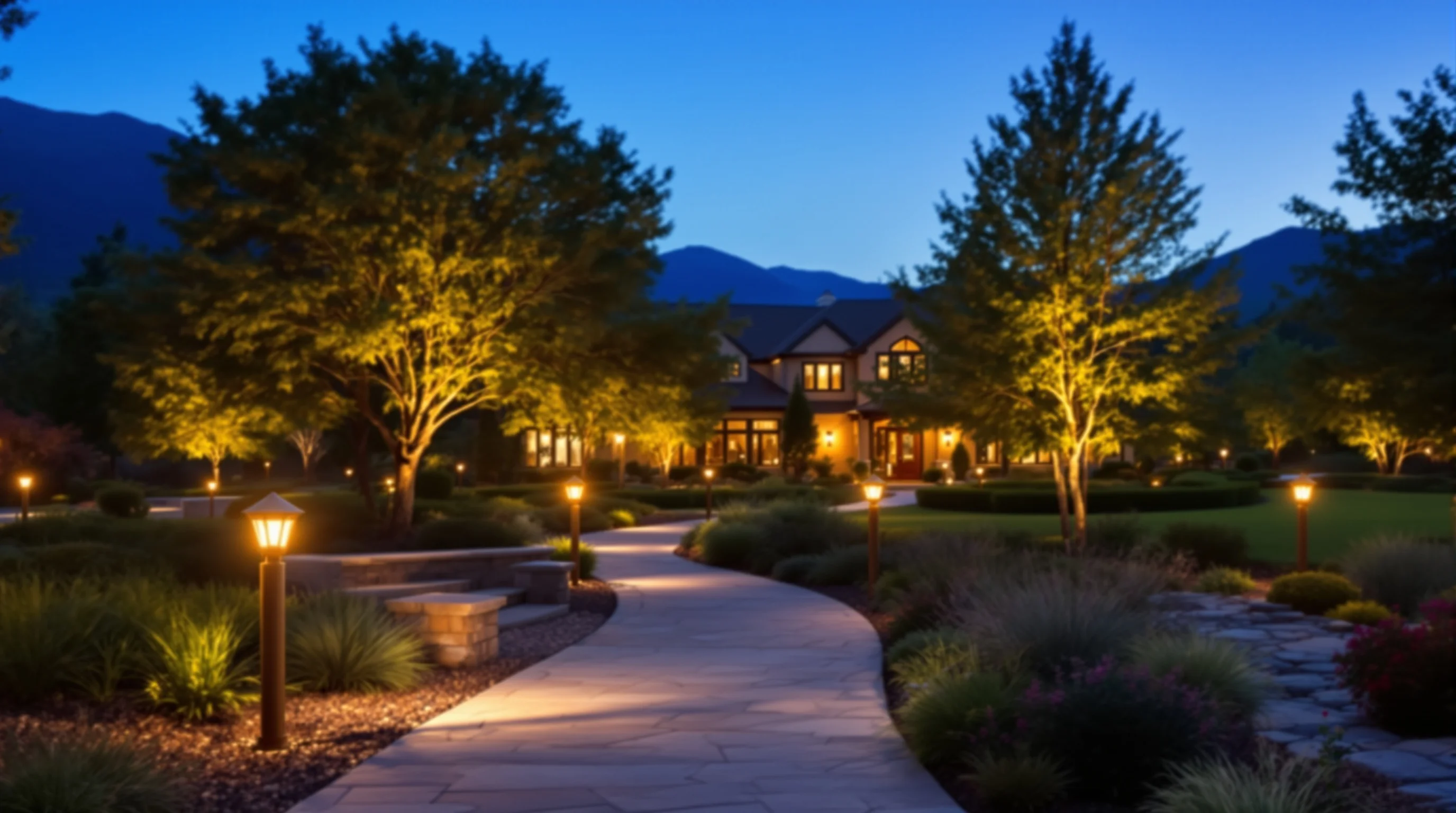 Low-voltage landscape lighting that highlights your stonework, plantings, and mountain views without washing out the night sky.